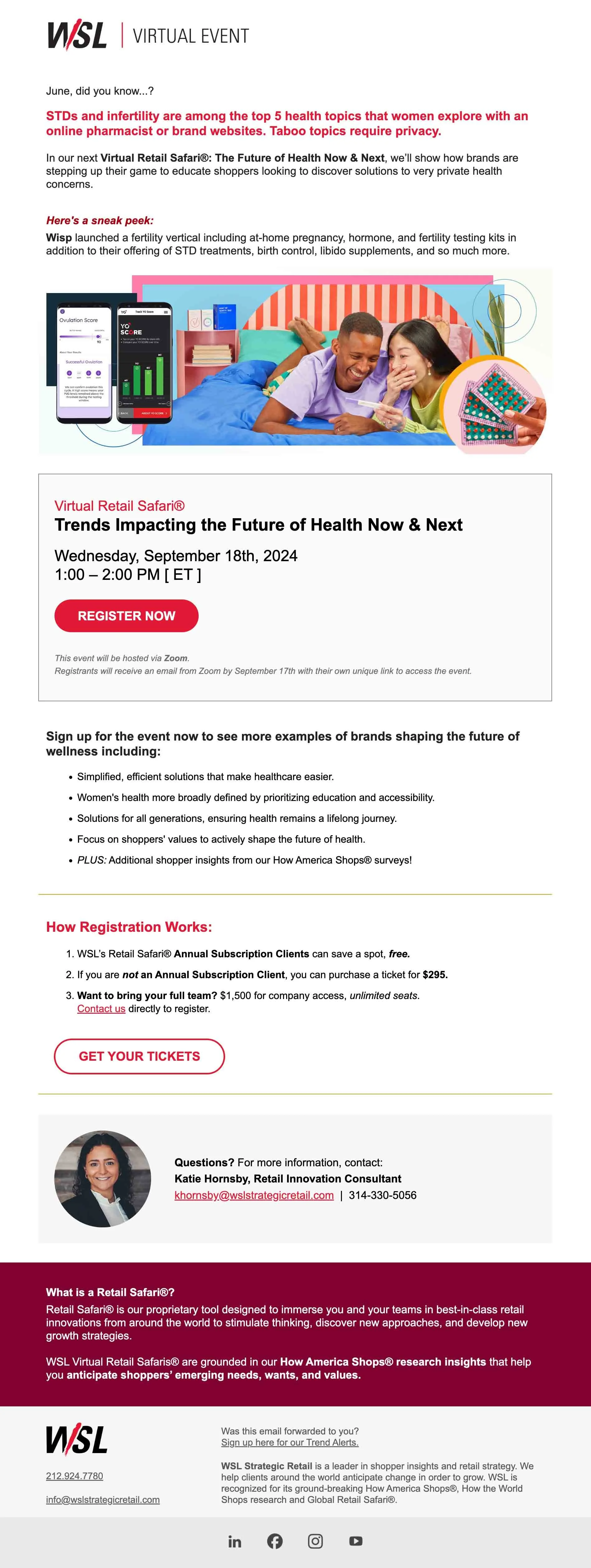 Email campaigns designed and scheduled in Constant Contact, with a transition to HubSpot in mid-2025. Graphic assets were created in Adobe, and each campaign was tailored to promote recent content—including blogs, podcasts, reports, retail innovation newsletters—as well as events and themed communications like year-end roundups. Emails were distributed to clients and Trend Alert subscribers.